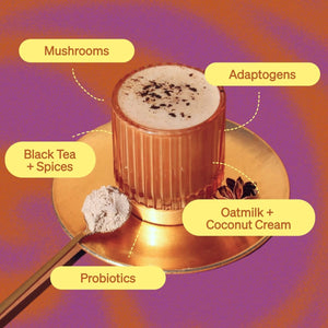 A classic, creamy chai latte in an instant. A delicious blend with the perfect amount of caffeine from black tea for energy without the crash. Upgraded with mood-boosting, stress-soothing adaptogens and probiotics for gut health. With oat and coconut milk already in the mix, all you have to do is add water!